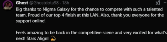 非常感谢Nigma给我与如此有天赋的队伍一起并肩战斗的机会。能在这个线下赛进入前四我感到很自豪。也感谢所有在线上支持我们的人!