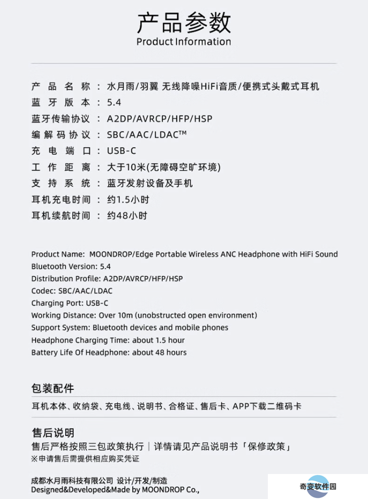 本站附水月雨「羽翼 Edge」头戴式耳机产品参数如下: