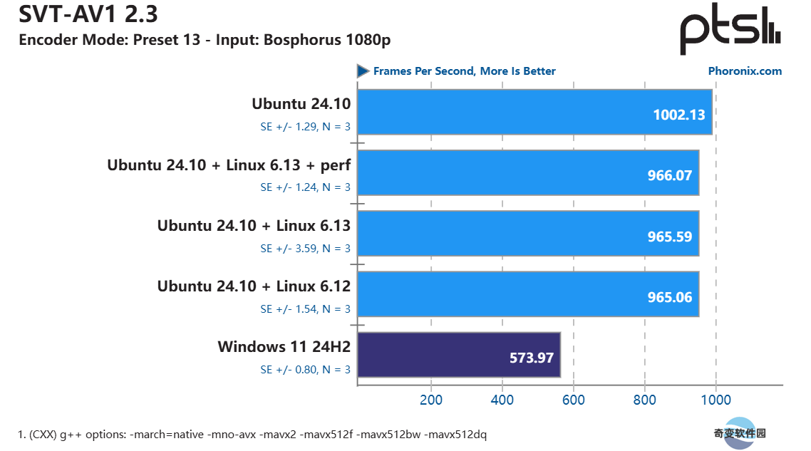 在使用 SVT-AV1 程序的编码测试中,285K 在 Ubuntu 上的速度几乎可以说是 Windows 上的两倍,而其他基准测试在切换到 Ubuntu 后也出现了两位数的性能提升。