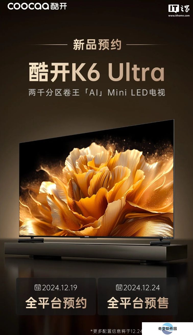 本站 12 月 19 日消息,创维酷开 K6 Ultra 电视现上架电商平台开启预约,新品电视号称“两千分区卷王「AI」Mini LED 电视”,首发 5999 元起。