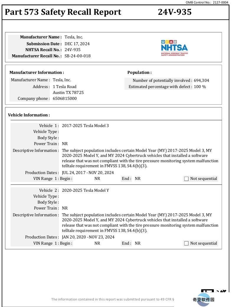 本站查询官方资料发现,此次召回涉及部分 2024 年款 Cybertruck、2017-2025 年款 Model 3 和 2020-2025 年款 Model Y,共计 694304 辆汽车,特斯拉将通过 OTA 无线更新解决问题。
