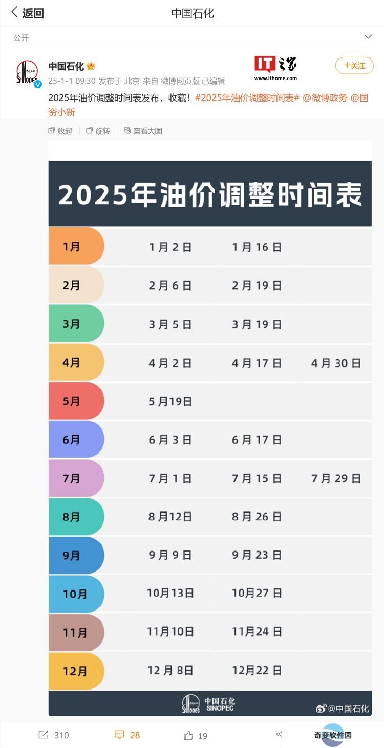 本站 1 月 2 日消息,@中国石化 昨日(1 月 1 日)发布微博,发布 2025 年国内成品油调整时间表,今年第一轮调价窗口将于 1 月 2 日 24 时开启,本轮调价上调与搁浅可能性并存。
