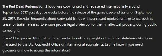 该网友指出,Rockstar Games在每次快要发布第二支预告时,都会在全球范围内对其游戏logo和名称进行版权注册。这一行为在《荒野大镖客:救赎2》(RDR2)和《GTA 5》等游戏发布前均有先例。