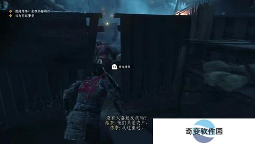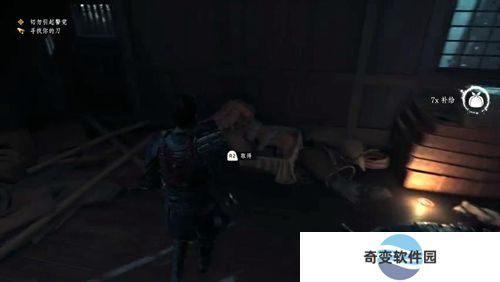 一路跟着脚印来到小屋内,里面有装备,但是没有剑,触发农妇帮忙掩护的剧情。