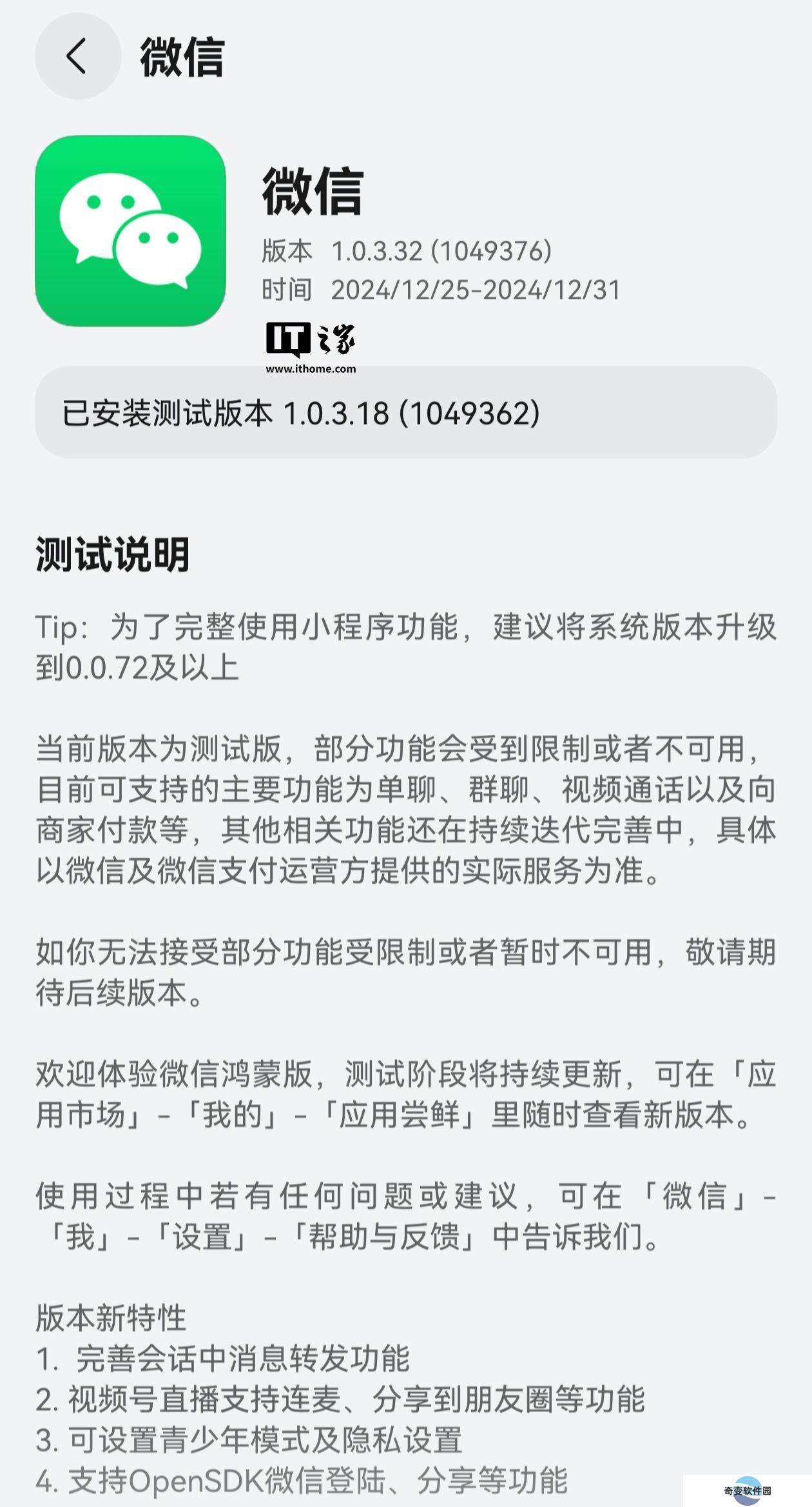 本站 12 月 25 日消息,纯血鸿蒙版微信 App 今日再次在华为应用市场(App Gallery)开启测试版 1.0.3.32(1049376)邀测升级,本次测试时间为 2024/12/25 - 2024/12/31。