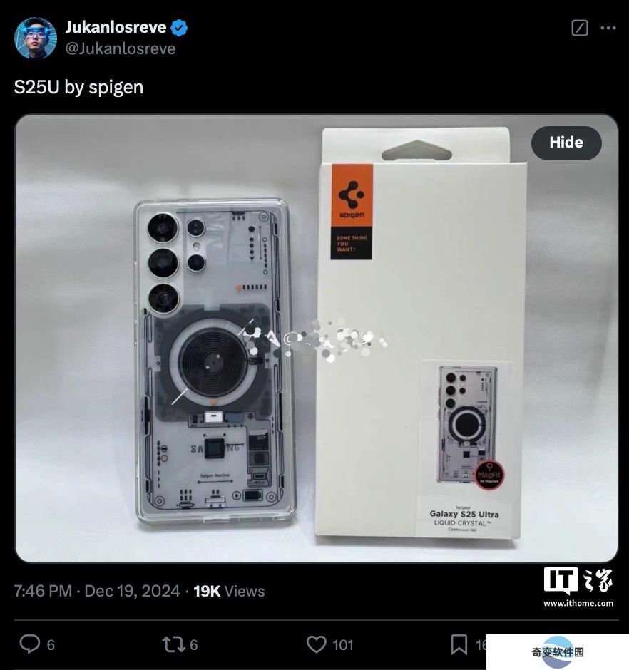本站 12 月 21 日消息,消息源Jukanlosreve在X平台发布贴文,展示了第三方制造商 Spigen 为三星 Galaxy S25 Ultra 打造的磁力无线充电手机壳,箱子的盒子上写着“MagFit for MagSafe”字样。
