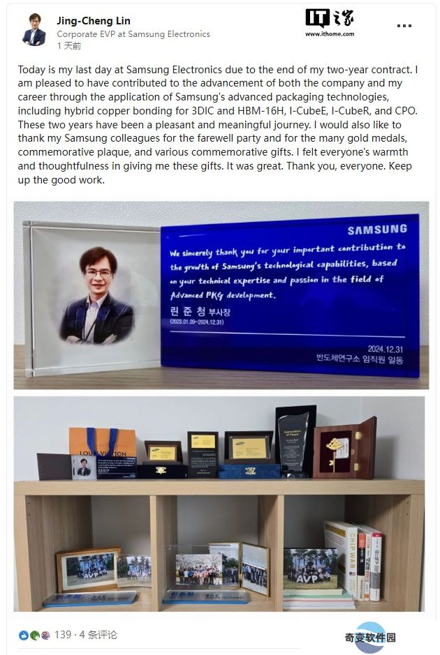 本站注意到,Jing-Cheng Lin 已在领英上确认了其从三星离职的消息,并表示其为期两年的合同已经到期。他还强调了自己在三星期间为先进封装技术做出的贡献,包括用于 3D IC 的混合铜键合技术以及 HBM-16H 的研发。